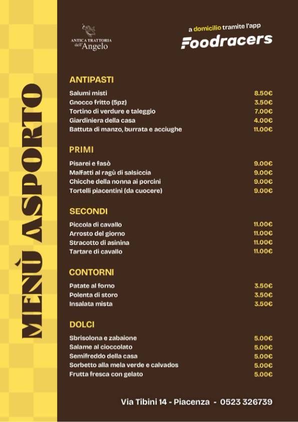 Se tutto ciò non bastasse, vi attendono i dolci fatti in casa, come il salame al cioccolato e i semifreddi. La cucina tipica piacentina e le specialità di Antica Trattoria dell'Angelo sono disponibili con consegna a domicilio grazie al servizio di Foodracers.